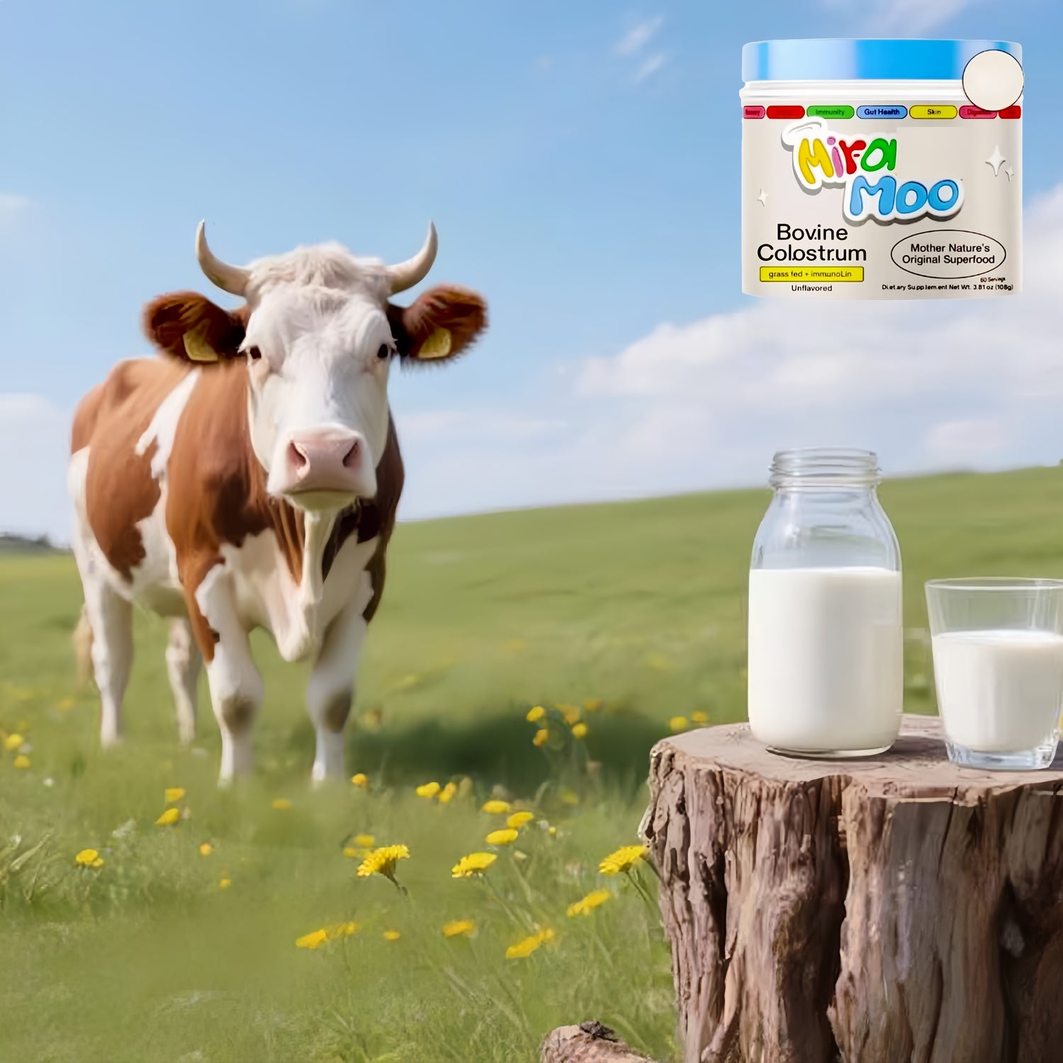 Experience the power of Miracle Moo Colostrum Powder Supplement. Strengthen your skin, lung, and gut barriers, rebuild your microbiome, and activate cellular health and performance. Unlock your body's full potential with our highly concentrated pure bovine colostrum superfood. With 30% IgG, it provides gut health, immune support, muscle recovery, and overall wellness. Gluten-free and unflavored, it is the perfect addition to your daily routine. Try Miracle Moo today and revive your whole body immune health.