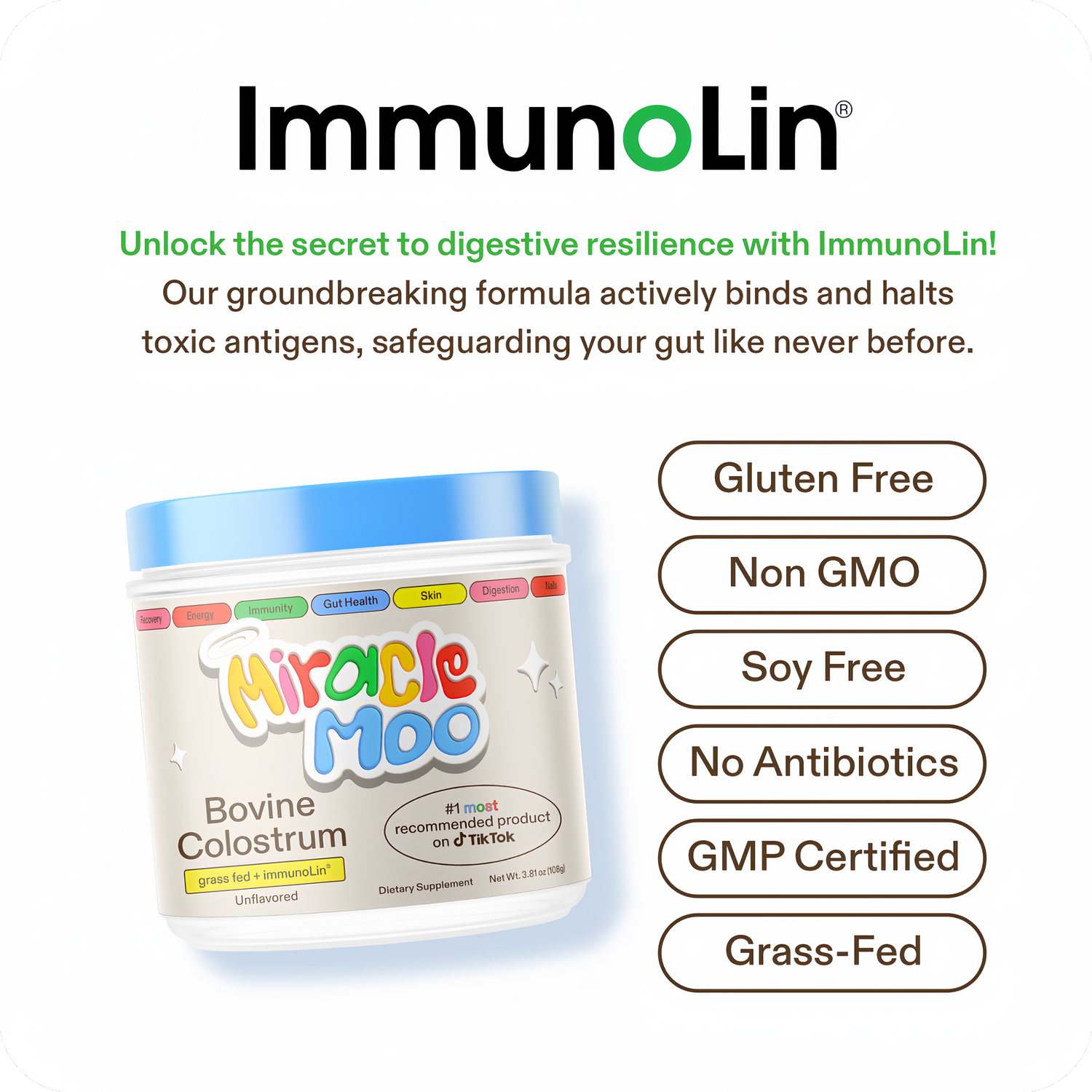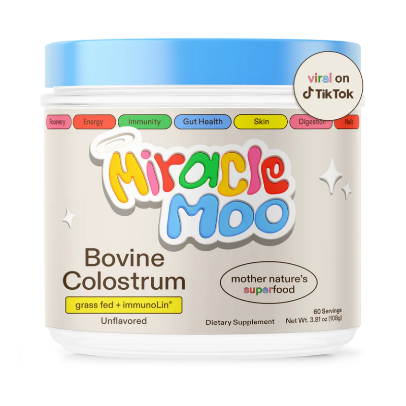 Discover the benefits of Miracle Moo's colostrum powder supplement for supporting gut health, immune function, muscle recovery, and overall wellness. Our highly concentrated, pure bovine colostrum superfood is gluten-free, unflavored, and provides 30% IgG to help maintain healthy skin, lung, and gut barriers, support a balanced microbiome, and promote cellular health and performance.